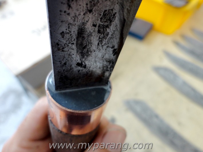 I asked Ah Ming when he was demonstrating the heat treatment if there was any difference in using water or oil. He said no, but he mentioned that the oil is much messier , as it leaves a greasy surface on the blades.