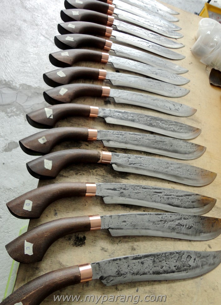 This post will be pretty short, but there will be lots of pictures. It takes quite a few steps to make one complete parang, but the final results are much what we were expecting, actually even better. As you can see from the pictures, here is the first batch of goloks from myparang . The blanks get a ride on the belt sander to smoothen the spine and clean up the side surfaces.