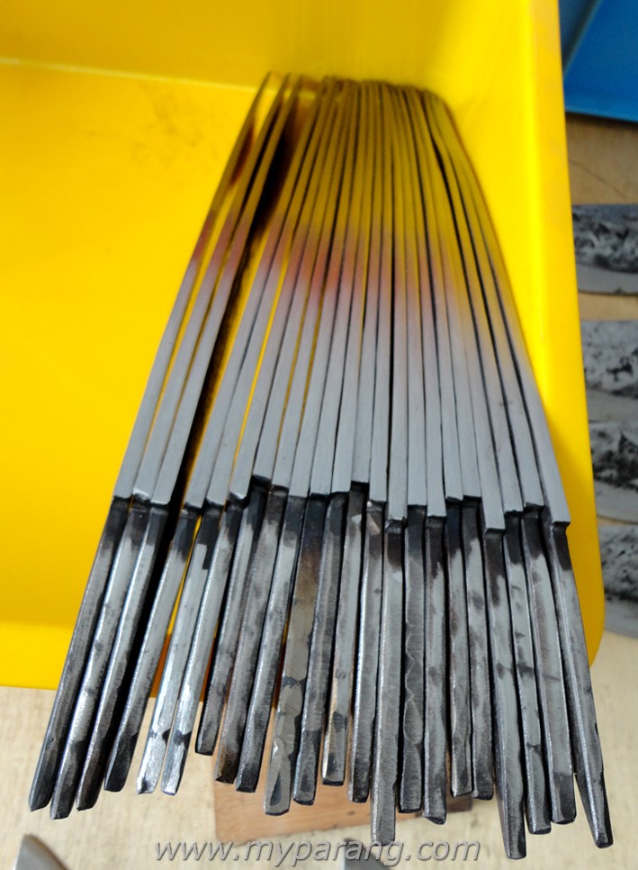 A Parang blank ready to be sent for heat treatAh Ming firing up the forge to heat treat some blades. Note that he uses the charcoal forge and not the gas.Heat treat done in Oil .