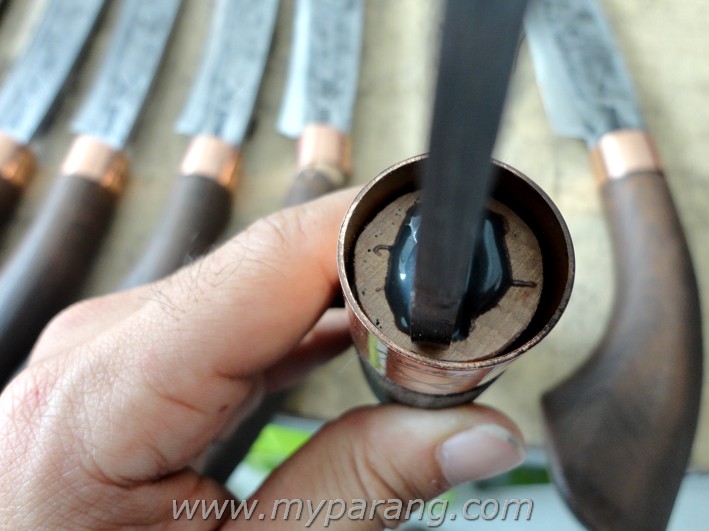 I know some of you will be asking – ” but they are stick tang , the blades will fly out when I use them” Actually no, as we do not take shortcuts. We grind the tangs to bare metal, clean it up with solvents and use industrial strength epoxy. We do not use commercial bought epoxy as we do not have the necessary technical data to make us decide which is the best. We narrowed down two types of epoxy and finally chose one with very high specifications. To add to that, we also have added a 3.0 mm brass pin under the copper collar to add further security and a peace of mind. So IF the tang does come loose, no way will it “fly” out. The brass pin will never fall out as well, as it is held in between the copper collar . Good luck trying to loosen the tang anyway.