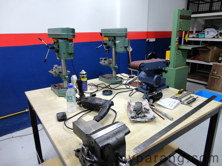 Finally we had all the tables fixed and positioned , plus had all the machines bolted on. We figured out it would be best to bolt all the machines in the myparang workshop so they cant be moved around , you know sometimes staff think they know better….. Plus bolted means they are more sturdy and will not topple or fall off. The main worktable looks pretty cluttered with the Bench Vise, Belt Sander and Drill Press , but there is enough space around each tool to work comfortable and safely . We left one table completely free for options later on. We might move some tools over, but that will come later. Even if we need to, we might add in another worktable.